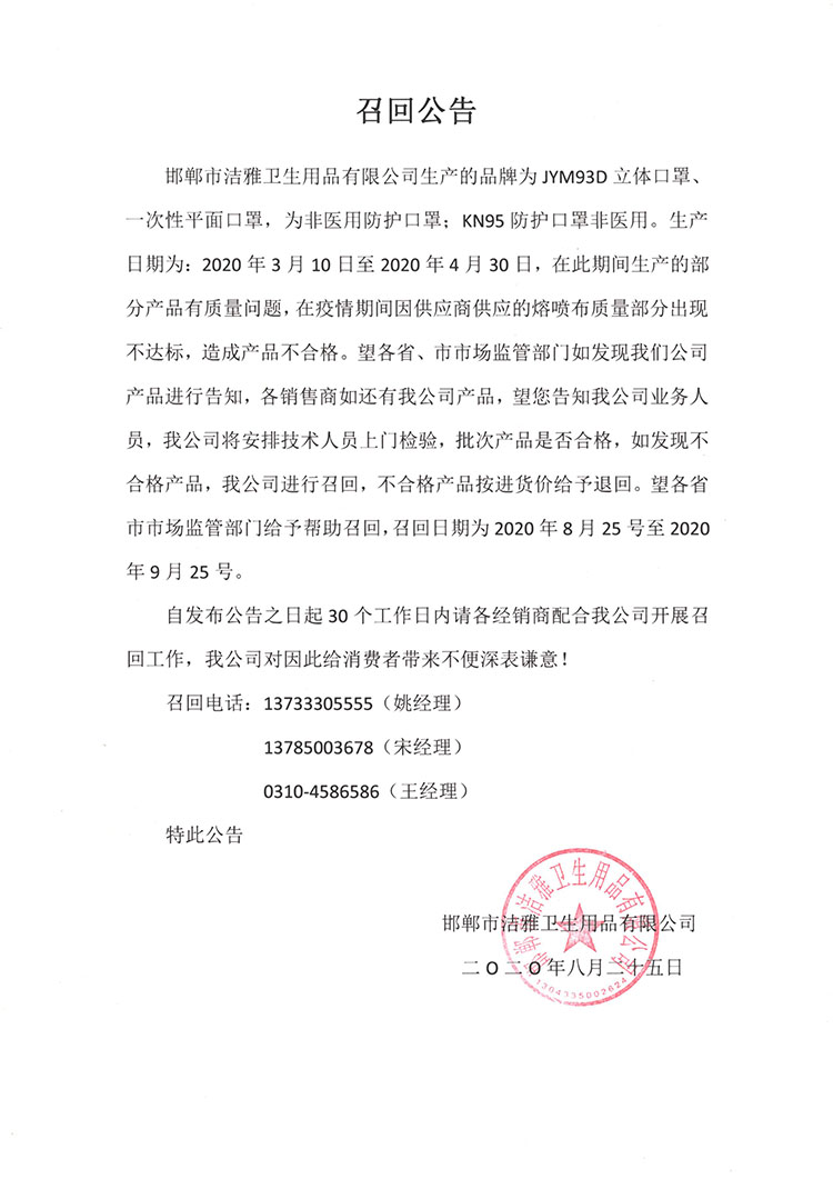 邯鄲市潔雅衛(wèi)生用品有限公司生產(chǎn)的品牌為JYM93D立體口罩一次性平面口罩,為非醫(yī)用防護(hù)口罩;KN95 防護(hù)口罩非醫(yī)用。生產(chǎn)日期為:2020年3月10日至2020年4月30日,在此期間生產(chǎn)的部分產(chǎn)品有質(zhì)量問題,在疫情期間因供應(yīng)商供應(yīng)的熔噴布質(zhì)量部分出現(xiàn)不達(dá)標(biāo),造成產(chǎn)品不合格。望各省、市市場監(jiān)管部門如發(fā)現(xiàn)我們公司產(chǎn)品進(jìn)行告知,各銷售商如還有我公司產(chǎn)品,望您告知我公司業(yè)務(wù)人員,我公司將安排技術(shù)人員上門檢驗(yàn),批次產(chǎn)品是否合格,如發(fā)現(xiàn)不合格產(chǎn)品,我公司進(jìn)行召回,不合格產(chǎn)品按進(jìn)貨價(jià)給予退回。望各省市市場監(jiān)管部門給予幫助召回召回日期為2020年8月25號至2020年9月25號